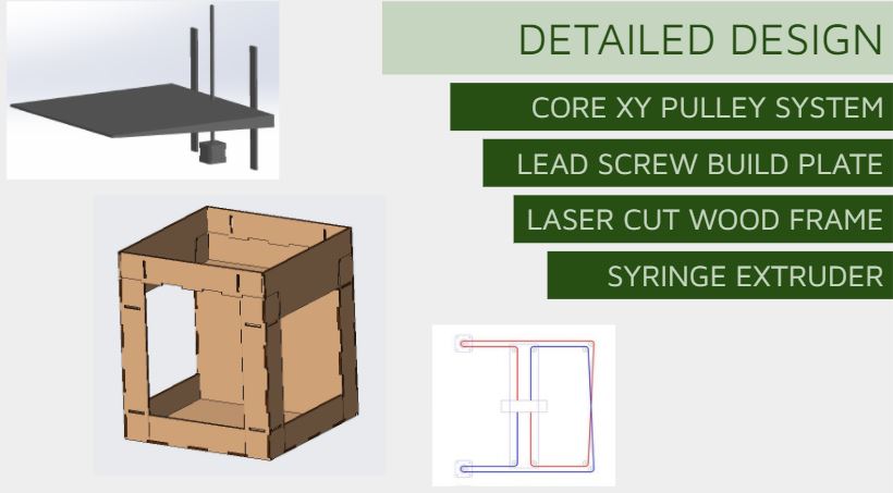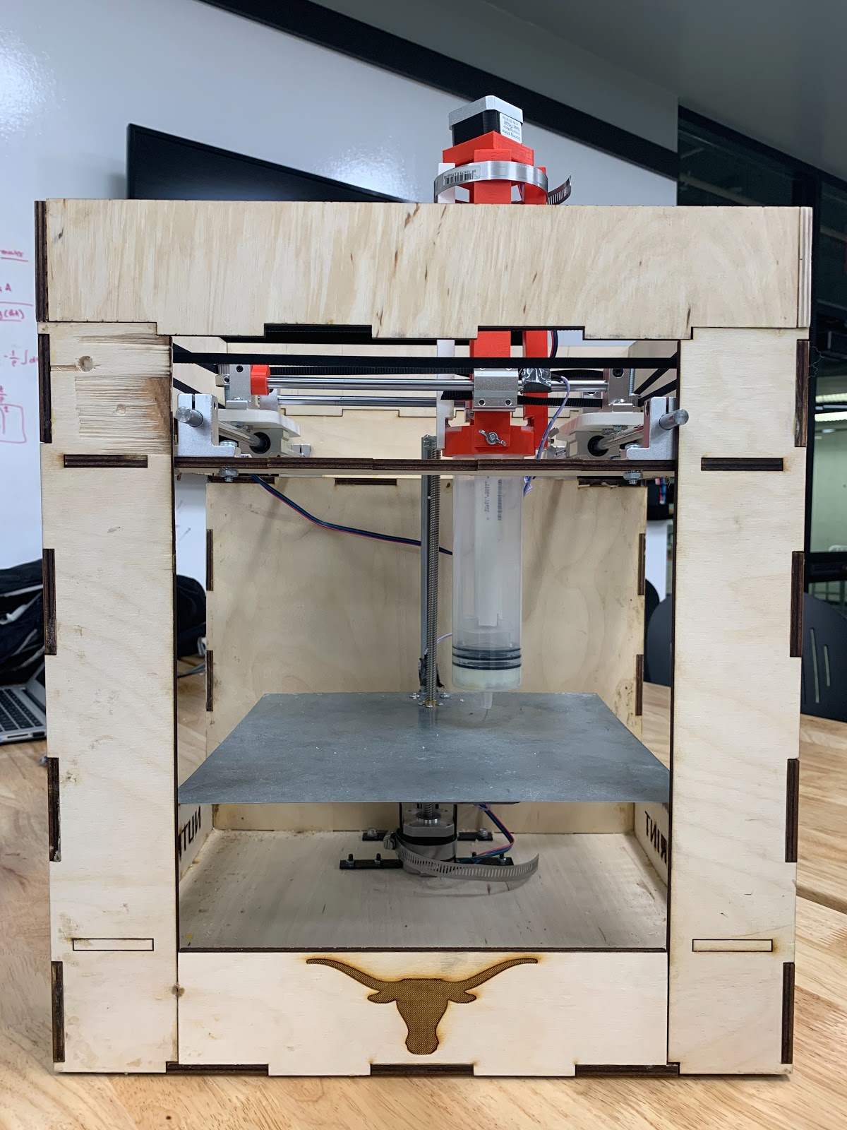 The final CAD design is shown below. A syringe like extruder squeezes out the food while a core xy gantry system controls the movement. The frame of the printer was laser-cut from ply wood.