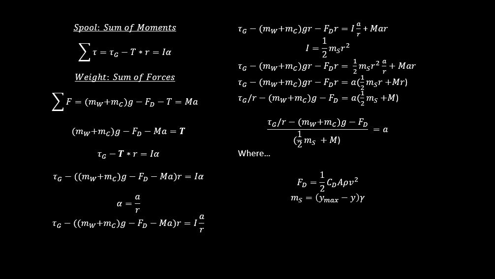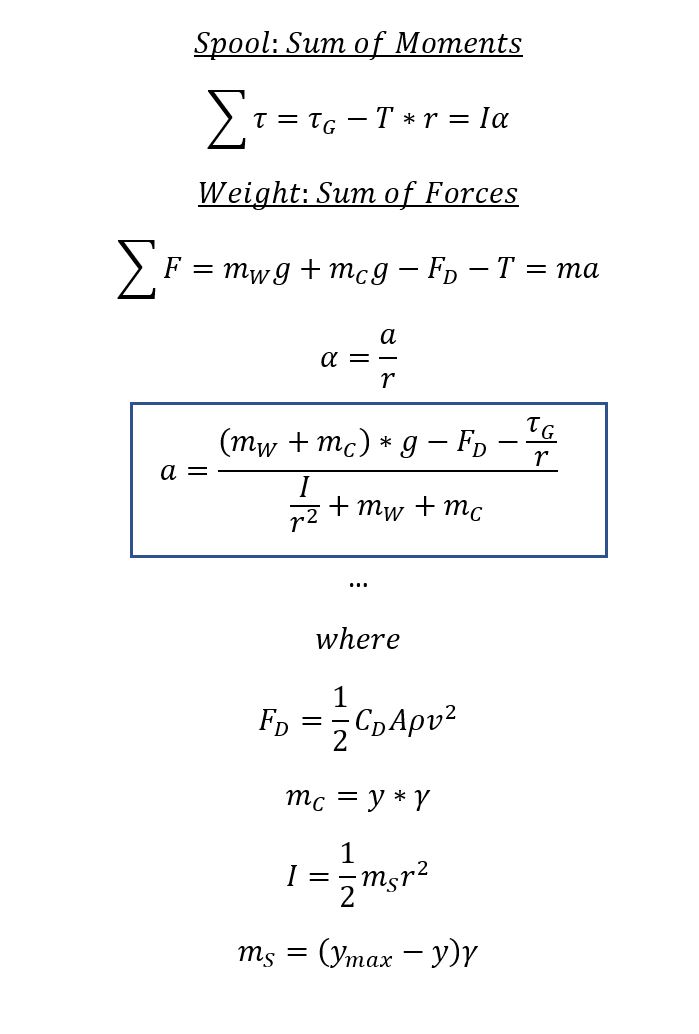 The equation of motion for the falling weight can be determined by summing the moments about the spool and the vertical forces about the weight. Recall that the sum of forces is equal to mass * acceleration, and the some of moments is equal to the rotational moment of inertia * angular acceleration.
