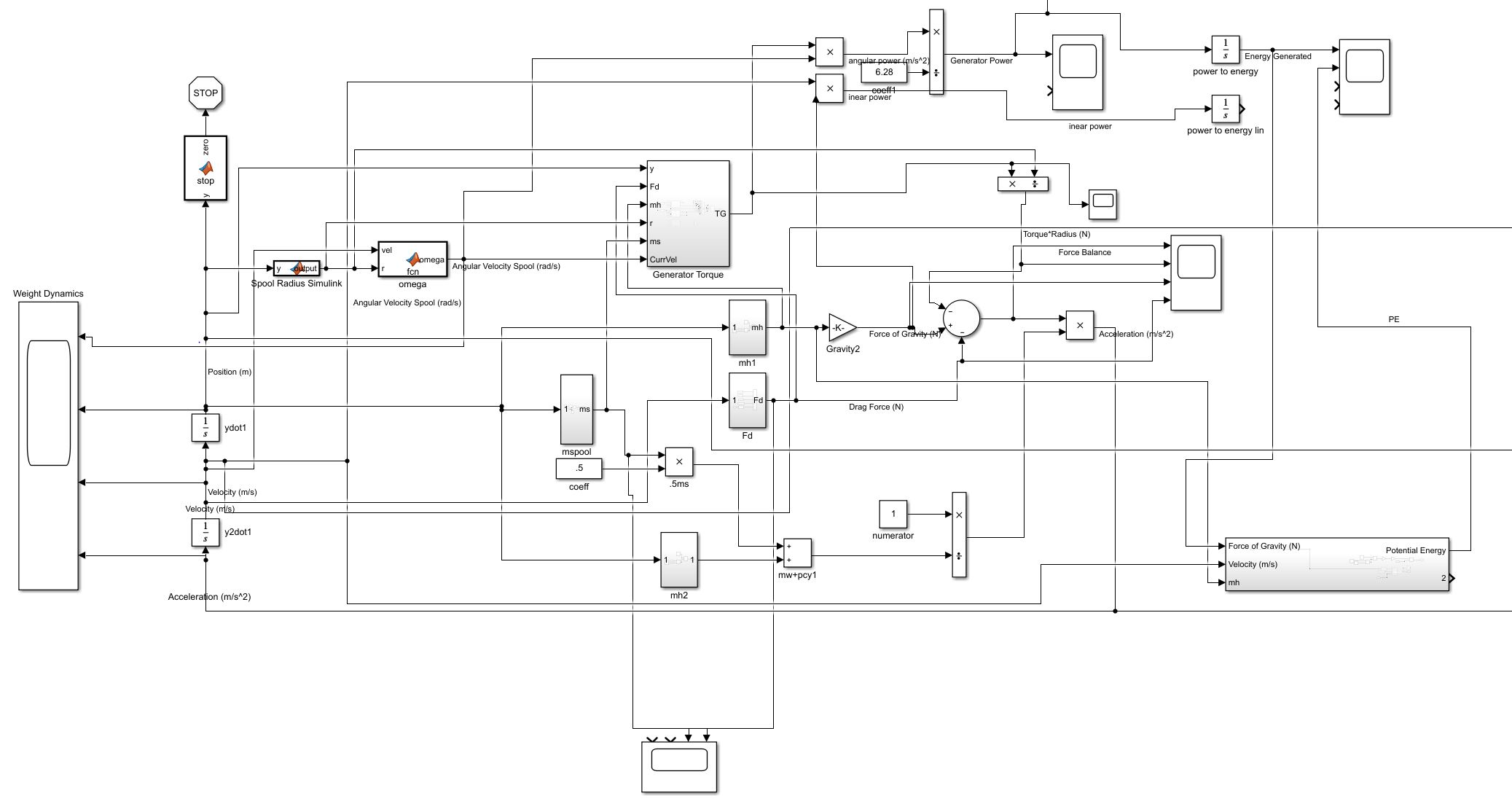 The proliferation of solar and wind power has created a growing demand for energy storage. My senior design team was tasked with creating a gravitational energy storage device to meet this need in a safe and environmentally friendly way. The scope of the project ranged from concept generation to small-scale prototyping. This webpage, however, focuses exclusively on the model I created that simulates the physical operation and transient power generation of our device. I found this part of the project to be particularly fascinating because of how many different classes I needed to apply to find a solution.